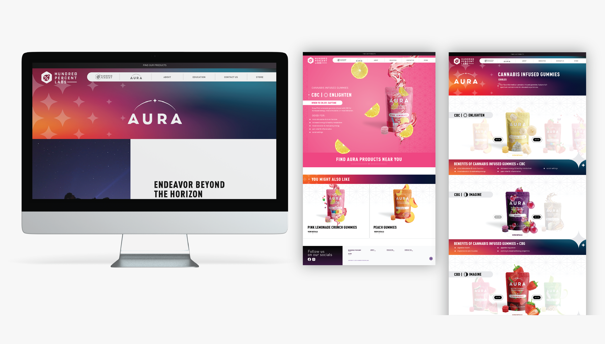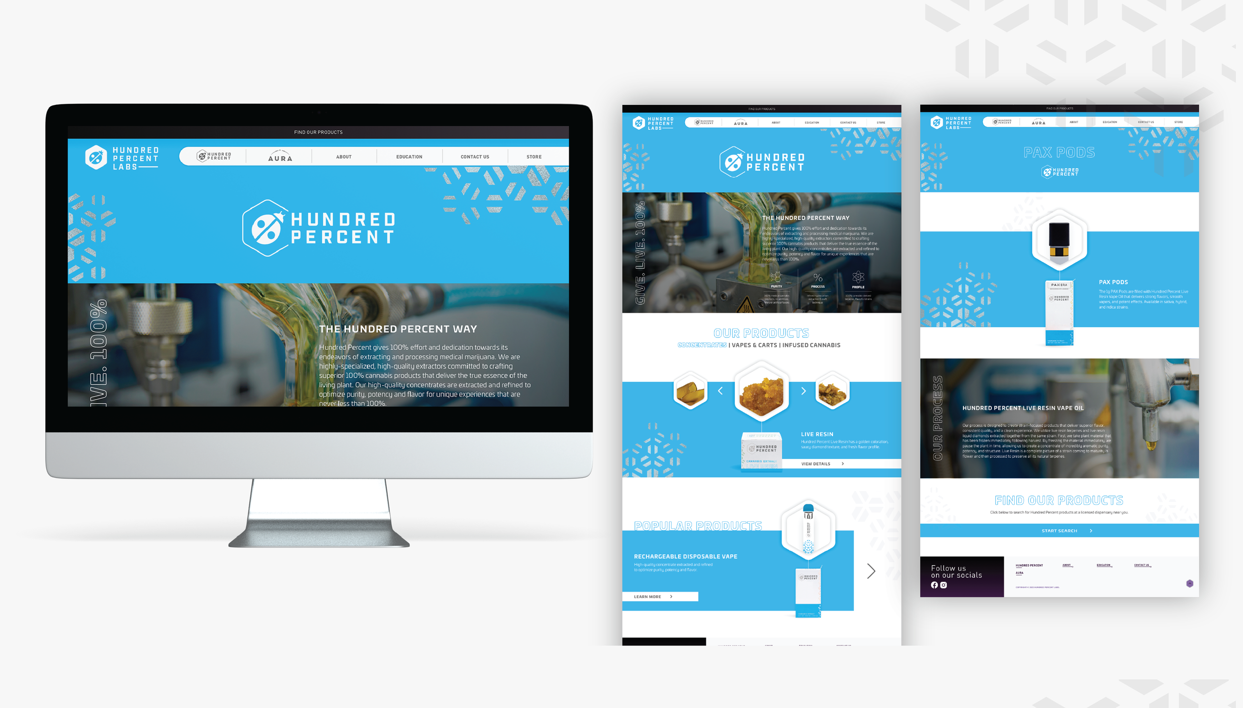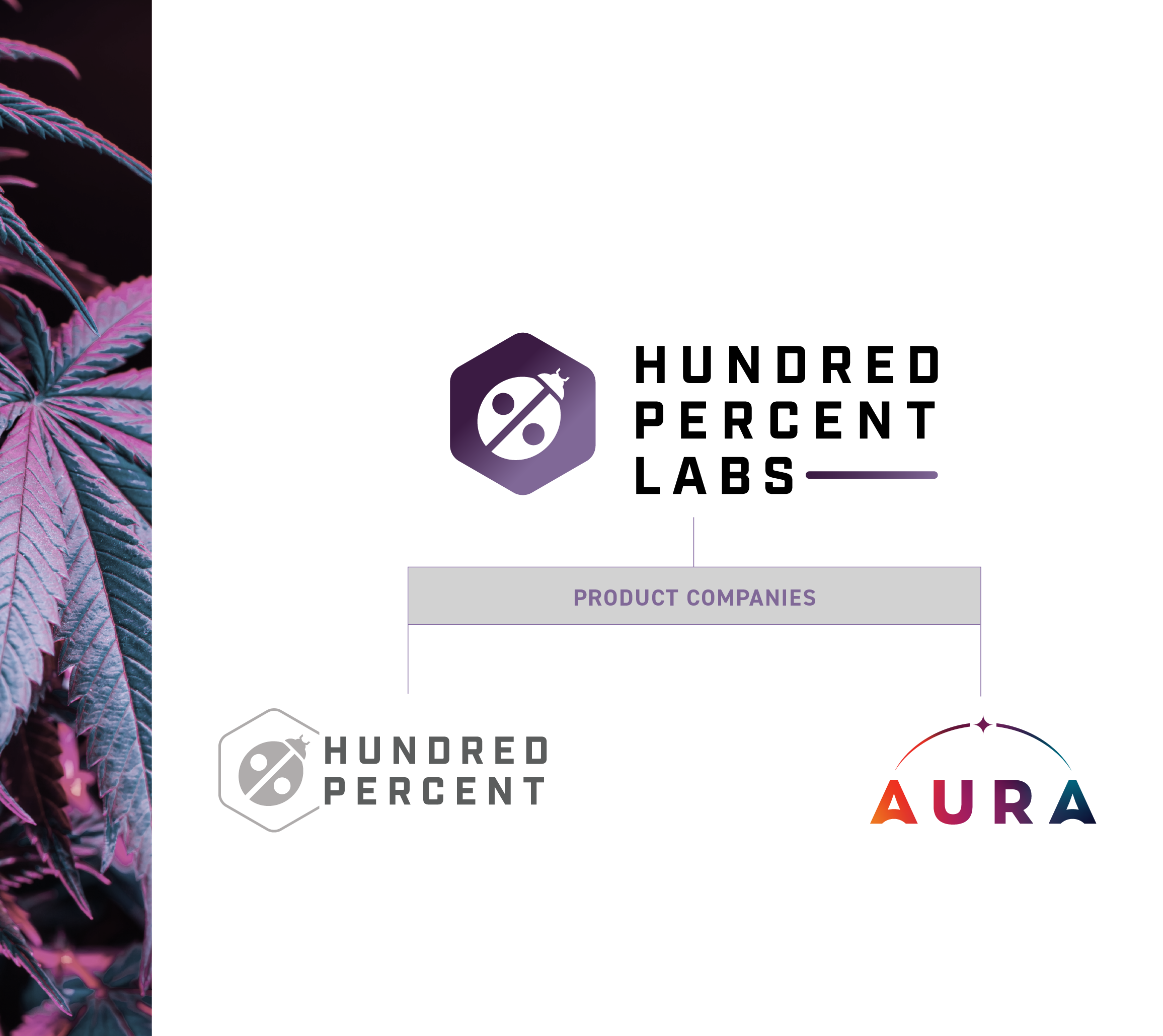 Our challenge was to develop a new architecture that would support their current and growing product and brand portfolio, but also serve as one cohesive system that creates positive brand equity built on craft, quality and variety. Our solution was to develop a “house of brands” architecture model starting with a unique and independent holding brand, Hundred Percent Labs, with its own assets and messaging. Their two current product brands, Hundred Percent and Aura, would also have their own unique assets and live beneath the holding brand as part of their growing family of brands.