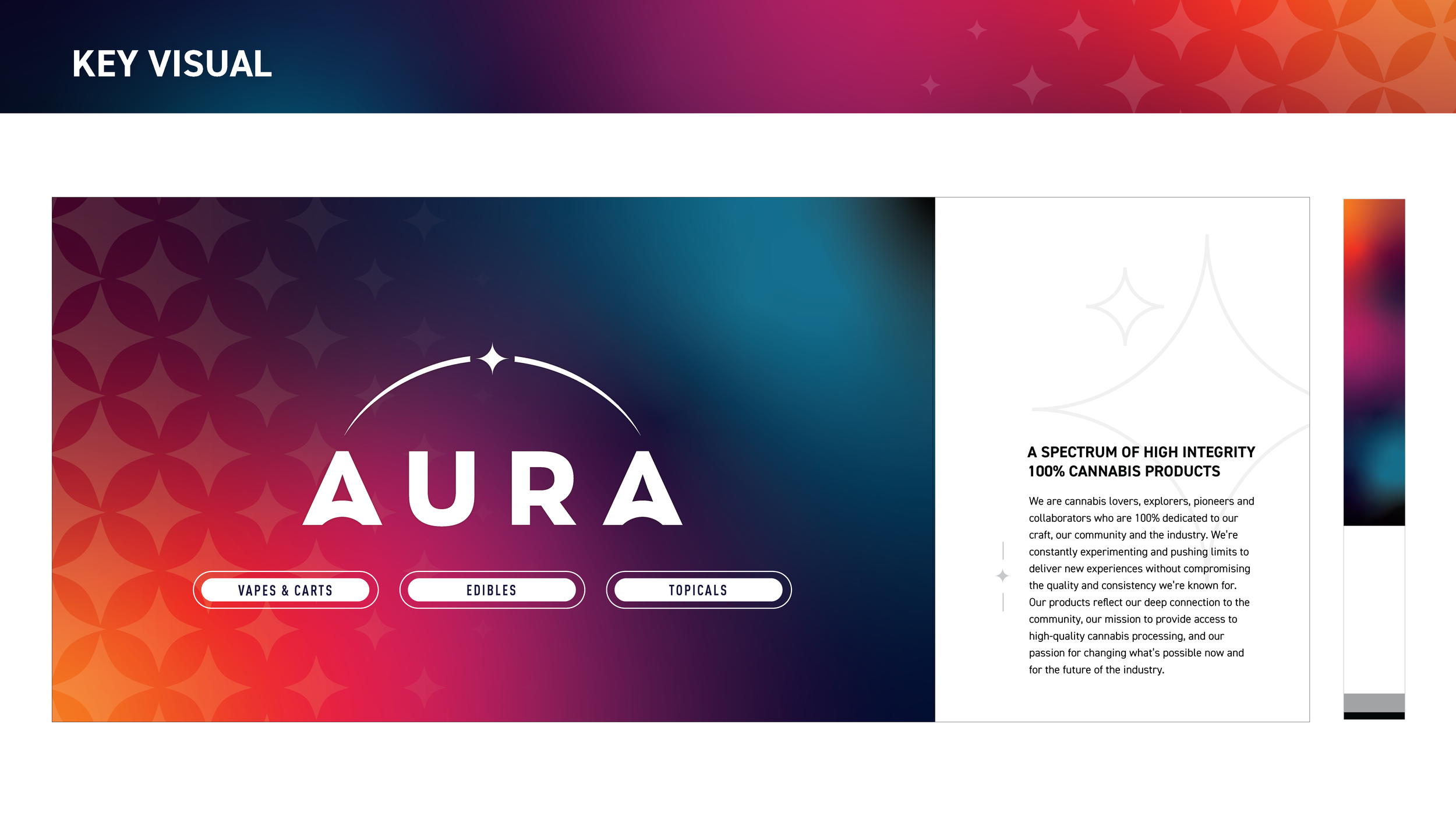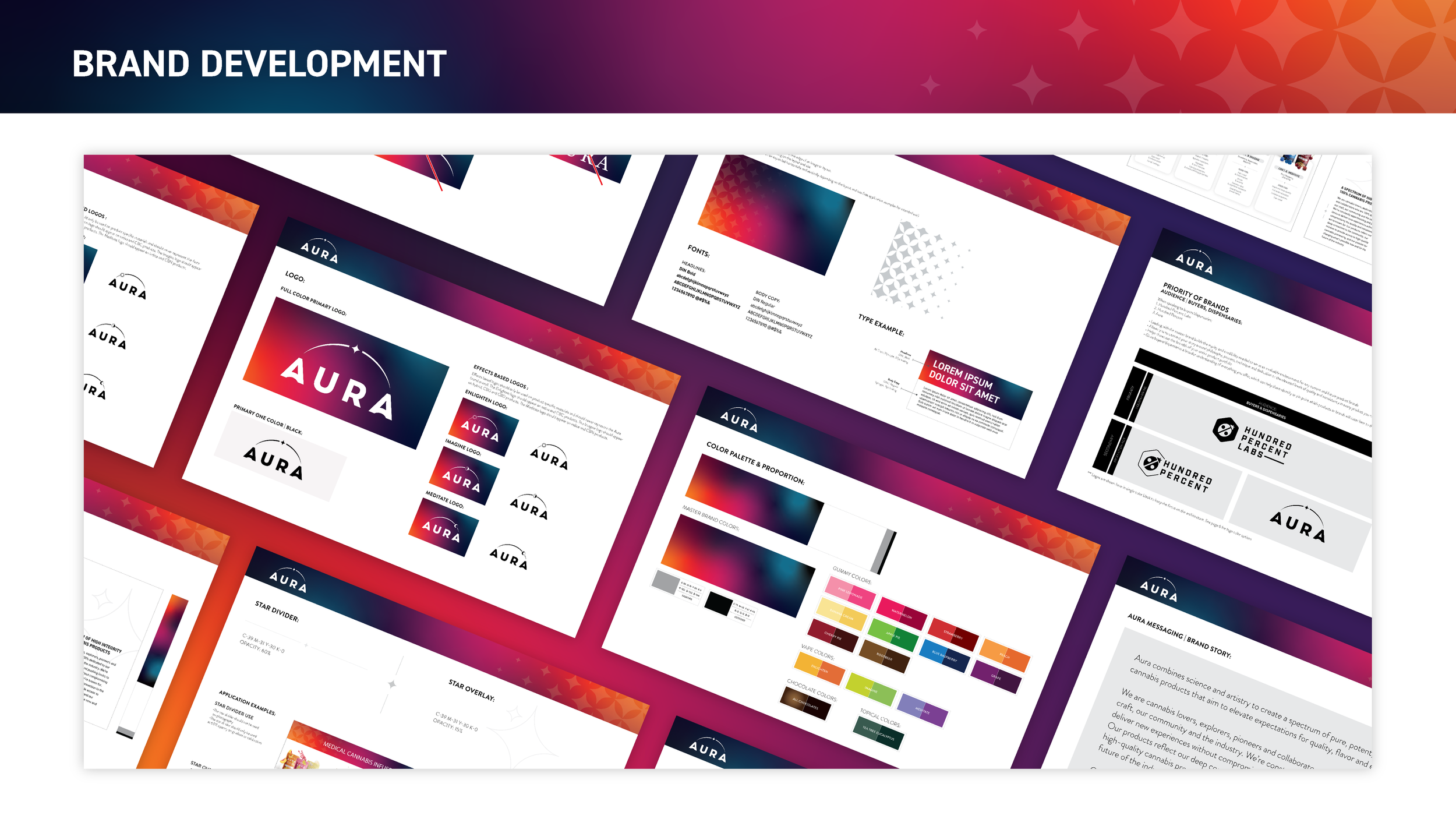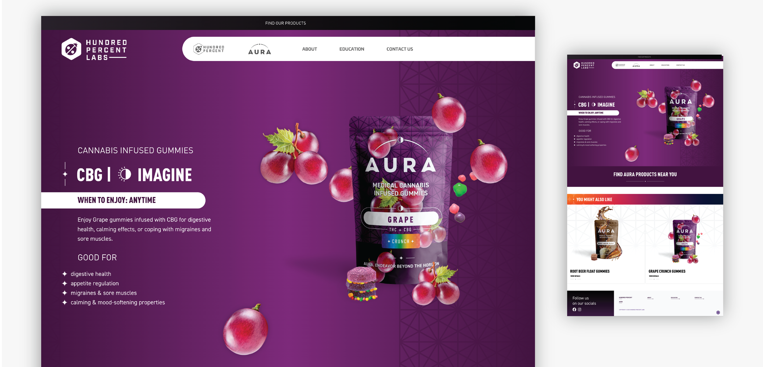Our challenge was to develop a new architecture that would support their current and growing product and brand portfolio, but also serve as one cohesive system that creates positive brand equity built on craft, quality and variety. Our solution was to develop a “house of brands” architecture model starting with a unique and independent holding brand, Hundred Percent Labs, with its own assets and messaging. Their two current product brands, Hundred Percent and Aura, would also have their own unique assets and live beneath the holding brand as part of their growing family of brands.